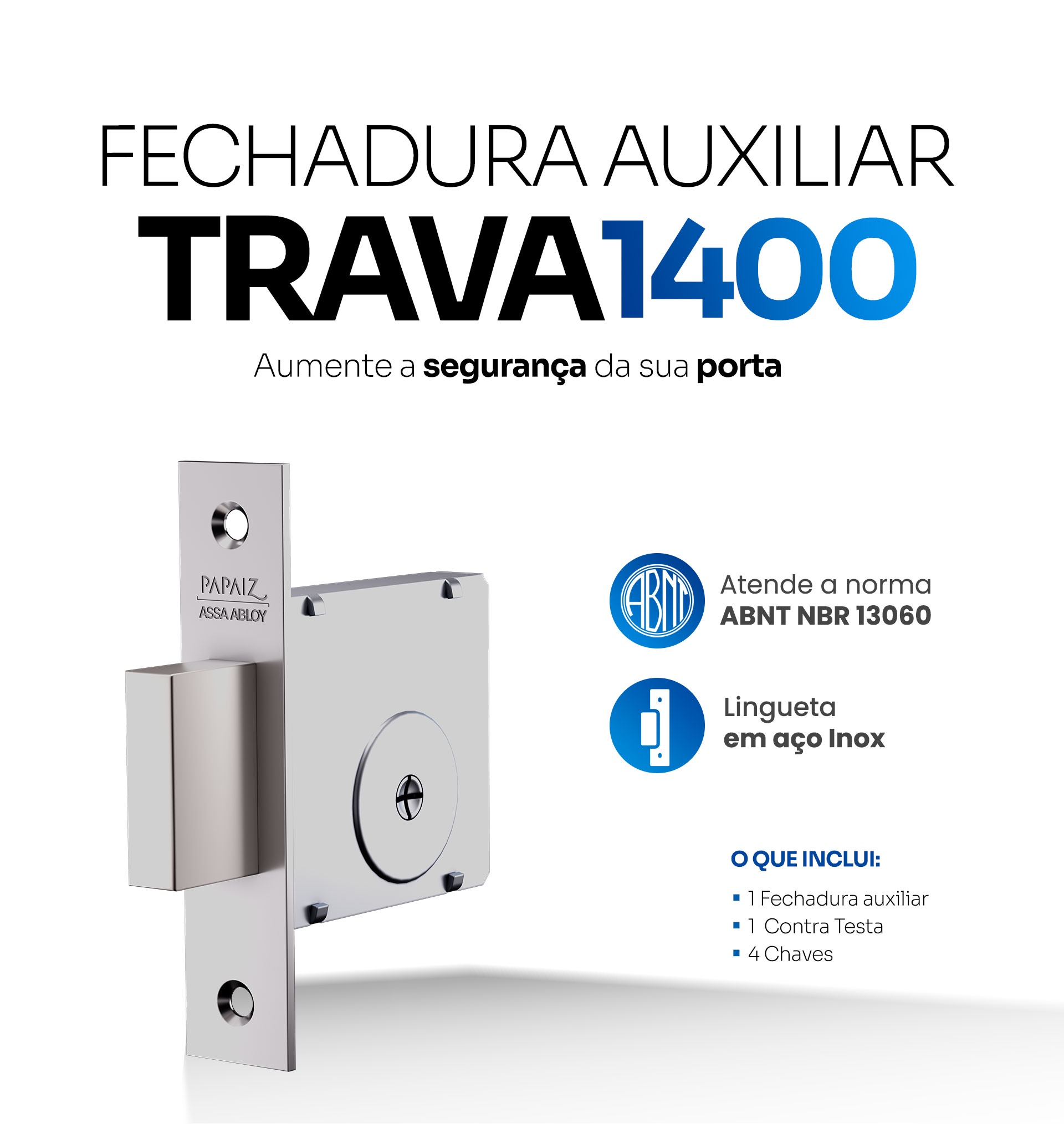 A Fechadura Auxiliar 1400 da Papaiz (referência 0309767CR) é uma das soluções mais tradicionais e confiáveis para reforçar a segurança de portas de madeira. Por ser um modelo “tetra” (chave cruz), ela oferece uma camada extra de proteção contra tentativas de arrombamento, sendo ideal para uso em conjunto com a fechadura principal.