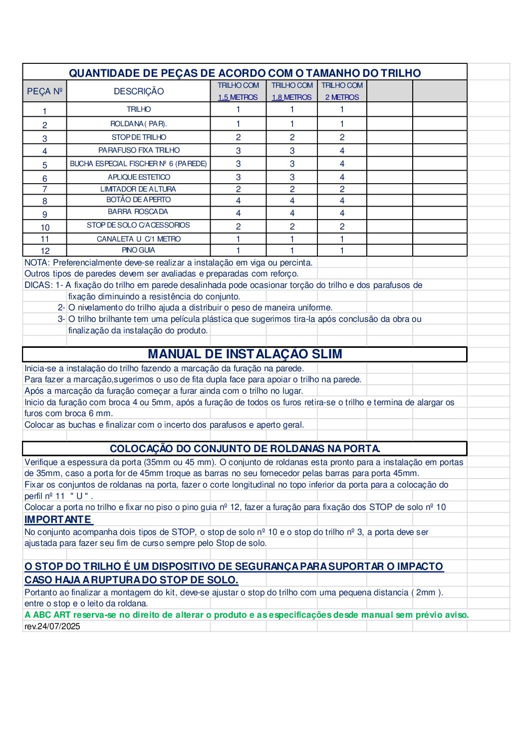 Inicia-se a instalação do trilho fazendo a marcação da furação na parede. Para fazer a marcação,sugerimos o uso de fita dupla face para apoiar o trilho na parede. Após a marcação da furação começar a furar ainda com o trilho no lugar. Inicio da furação com broca 4 ou 5mm, após a furação de todos os furos retira-se o trilho e termina de alargar os furos com broca 6 mm. Colocar as buchas e finalizar com o incerto dos parafusos e aperto geral. Verifique a espessura da porta (35mm ou 45 mm). O conjunto de roldanas esta pronto para a instalação em portas de 35mm, caso a porta for de 45mm troque as barras no seu fornecedor pelas barras para porta 45mm. Fixar os conjuntos de roldanas na porta, fazer o corte longitudinal no topo inferior da porta para a colocação do perfil nº 11 ” U ” . Colocar a porta no trilho e fixar no piso o pino guia nº 12, fazer a furação para fixação dos STOP de solo nº 10 IMPORTANTE No conjunto acompanha dois tipos de STOP, o stop de solo nº 10 e o stop do trilho nº 3, a porta deve ser ajustada para fazer seu fim de curso sempre pelo Stop de solo. O STOP DO TRILHO É UM DISPOSITIVO DE SEGURANÇA PARA SUPORTAR O IMPACTO CASO HAJA A RUPTURA DO STOP DE SOLO. Portanto ao finalizar a montagem do kit, deve-se ajustar o stop do trilho com uma pequena distancia ( 2mm ). entre o stop e o leito da roldana.