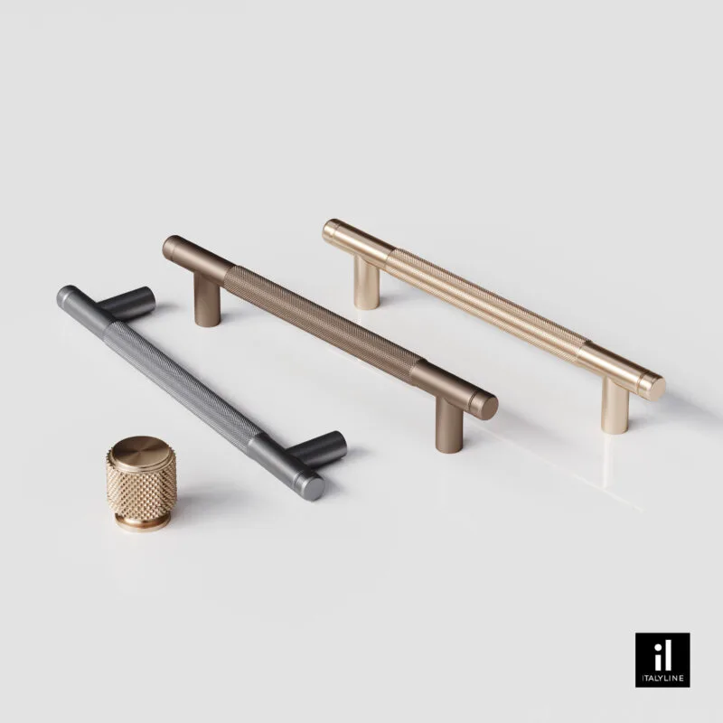 O Puxador Italy Line Zigrinato (IL1580) une a precisão técnica ao design contemporâneo. O termo “Zigrinato” refere-se ao acabamento recartilhado na superfície do metal, que além de proporcionar uma pegada antiderrapante e ergonômica, cria um efeito visual de joalheria no mobiliário.